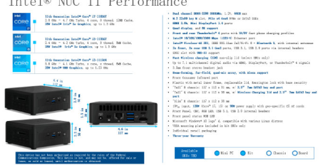 泄漏的信息确认了新的Panther Canyon NUC的正式名称为“ Intel NUC 11 Performance”,并且该系统将提供三种不同的处理器选项。Intel Core i3-1115G4(2核,4线程,Intel UHD图形),Intel Core i5-1135G7(4核,8线程,Intel Iris Xe图形)或Intel Core i7-1165G7(4核, 8线程,Intel Iris Xe图形)。