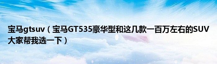 最佳答案大家好,小常来为大家解答以下问题,对于宝马gtsuv,宝马GT535豪华型和这几款一百万左右的SUV大家帮我选一下很多人还不知道,今天让我们一起来看看吧!1,宝马GT535豪华型和这几款一百万左右的SUV大家帮我选一下:保时捷卡宴基于大众途锐平台制造,动力强劲,配备V8发动机,外观也比其它车型好看的...