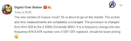 4月,华为发布了Huawei Nova 7 SE以及其他手机,例如Nova 7和Nova 7 Pro智能手机。根据中国专家的说法,该公司可能会很快推出新版本的Huawei Nova 7 SE智能手机。他透露,Nova 7 SE新版本的主要变化是它将配备Dimensity 800U芯片组。